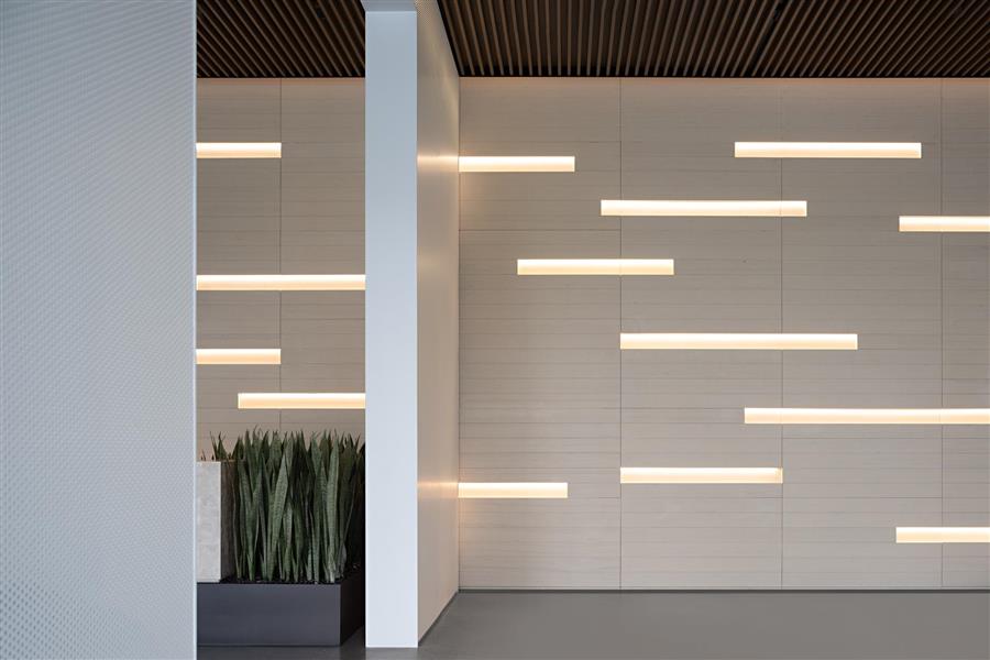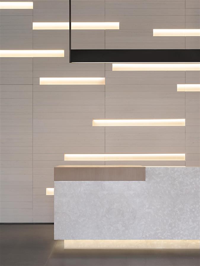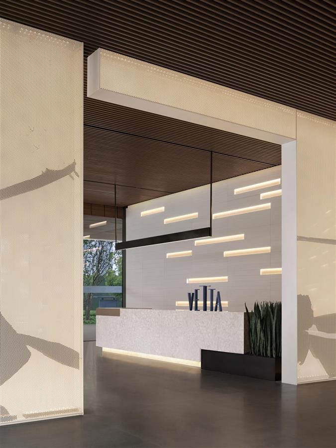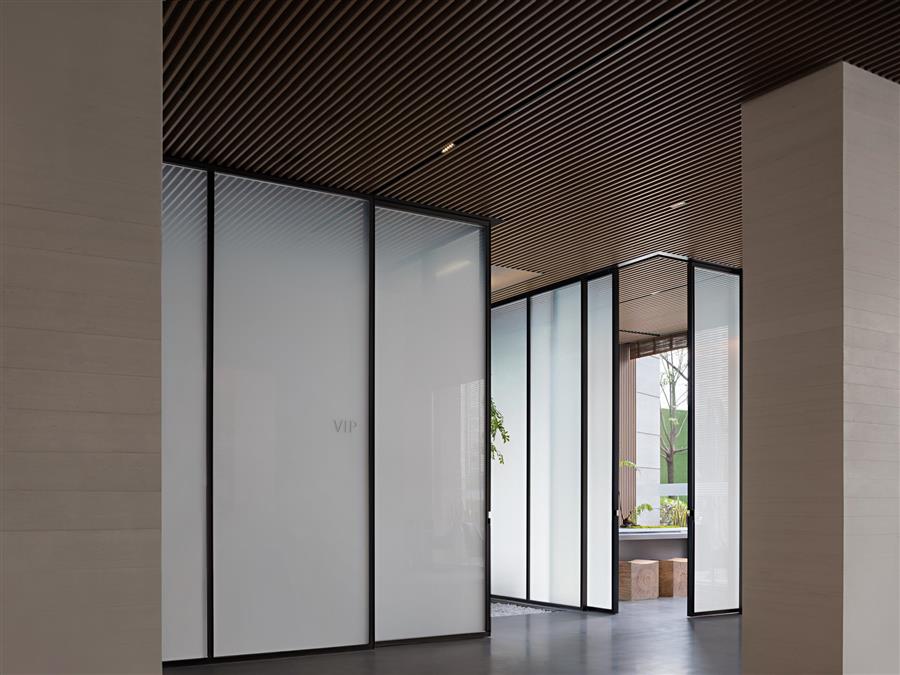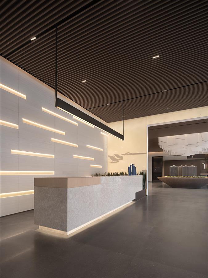 接待前廳刪繁就簡,借助石材與金屬的穿插組合,鏤空錯落的背景墻,輔以燈光的點(diǎn)綴效果,層次感與格調(diào)性頓生,予人端莊大氣的視覺觀感與心境體驗(yàn)。