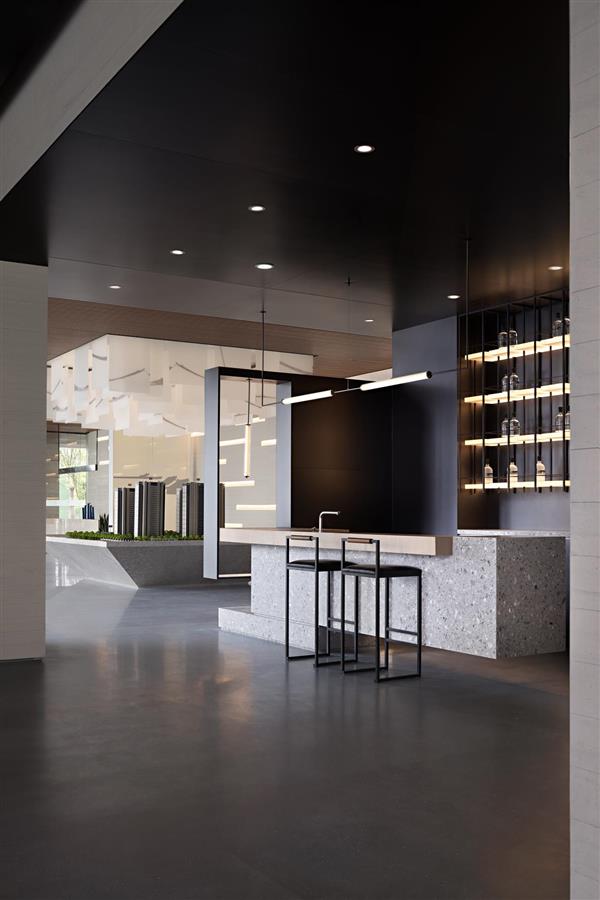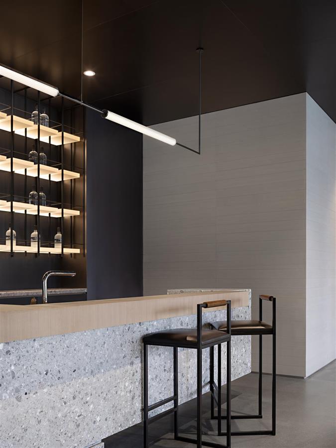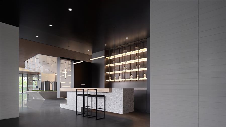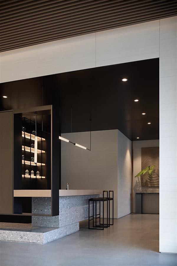 水吧臺在清晰嚴(yán)謹(jǐn)?shù)慕Y(jié)構(gòu)中相互穿插、滲透,縱橫交錯間又捕捉到不拘一格的隨性。素灰色的基底鋪陳出簡約的氣質(zhì),后方格架在燈光的映襯下,盡顯輕盈純粹風(fēng)范。