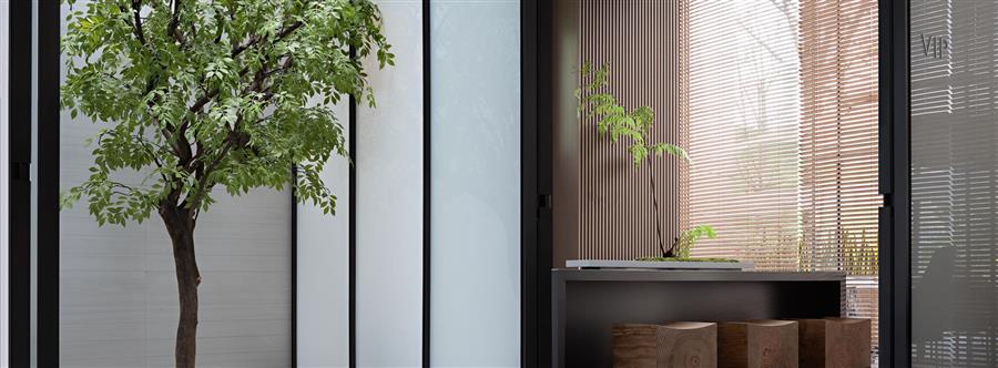兩個VIP室延續(xù)簡潔干練的筆觸,大片的格柵、利落的塊面孕育出素雅基調(diào),綠意妝點(diǎn)則為其注入生機(jī),彼此交匯,恰如其分的鋪展開安謐幽然的氣氛。
