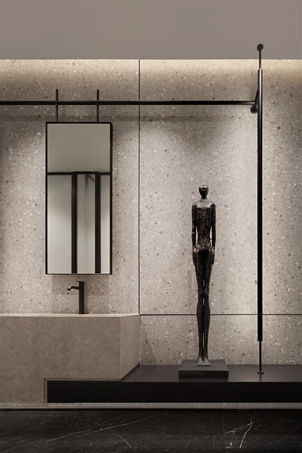 在衛(wèi)生間注重運(yùn)用解構(gòu)手法,讓不同材質(zhì)碰撞調(diào)和,高低起伏、明暗交織,充分調(diào)動視覺張力。