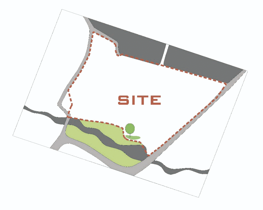 大井民宿東北向10km是丹霞山景區(qū),層巒疊嶂的山脈是得天獨厚的自然背景。場地西南面有一條曲徑延綿的小溪流經(jīng)過,仿佛一條絲帶將本場地與山野間的屋舍、田野聯(lián)系了起來。南面視野開闊,集中分布著連片且廣袤的農(nóng)田,同時聯(lián)絡(luò)外部的S246省道從農(nóng)田中穿越而過,為民宿帶來了外界的關(guān)注與活力。