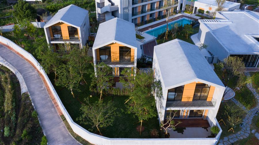 云山睥睨,遠(yuǎn)眺的山景滲透到休閑居住場景之中,拉近了游客與村落自然的距離。