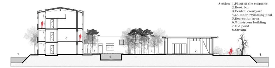 古樟樹作為建筑空間敘事的前言,“古橋、古井、古樟、溪流、院落”成為了設(shè)計的主要線索,運用內(nèi)、外空間的轉(zhuǎn)換、滲透來豐富建筑場景。