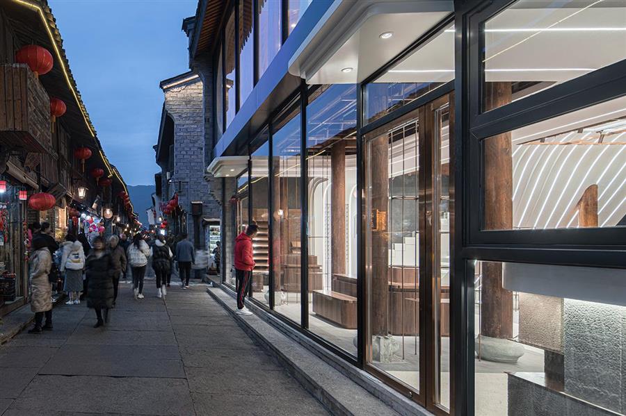 設(shè)計團隊將沿街面的門窗全部拆除,用黑色不銹鋼框架配以大面積落地門窗取而代之,讓原本昏暗狹小的空間變得明媚而通透,巨浪從二層噴涌而出,向古街注入現(xiàn)代氣息,使店鋪從紫陽街脫穎而出。