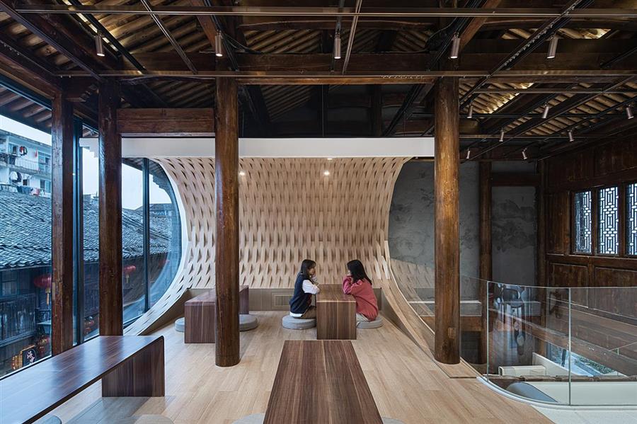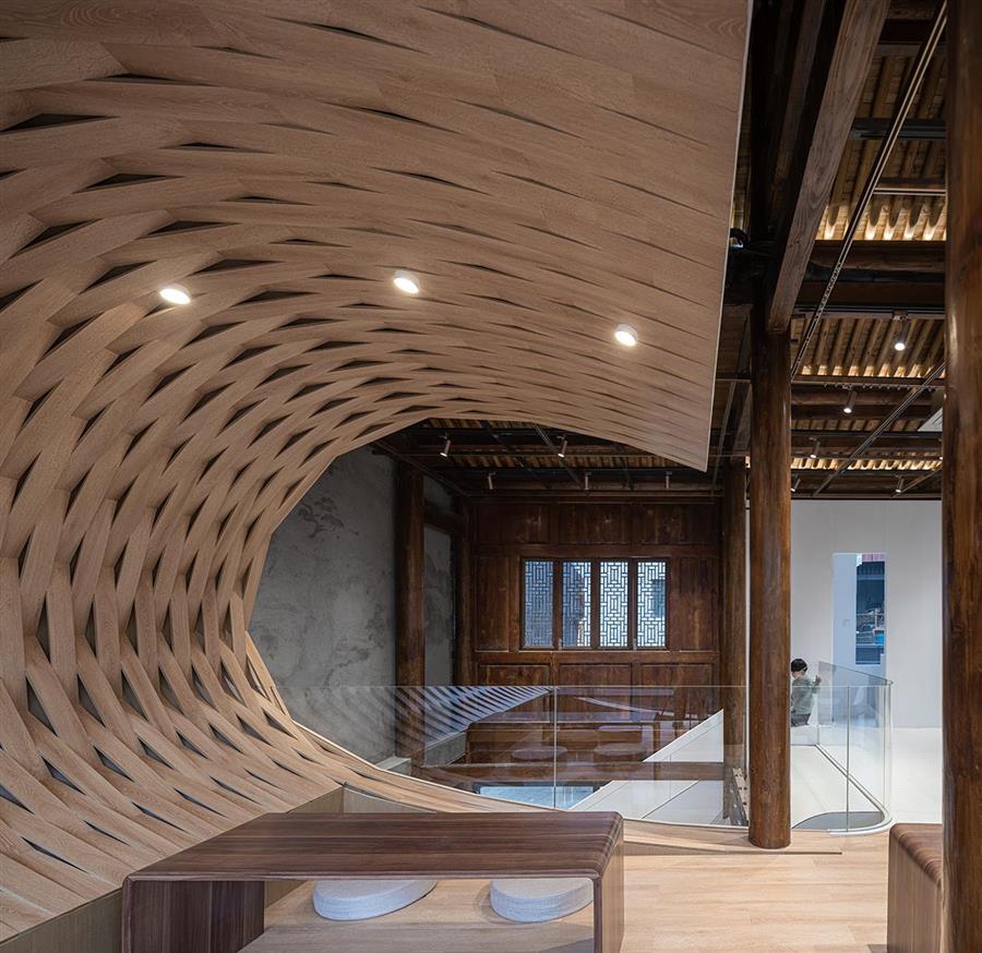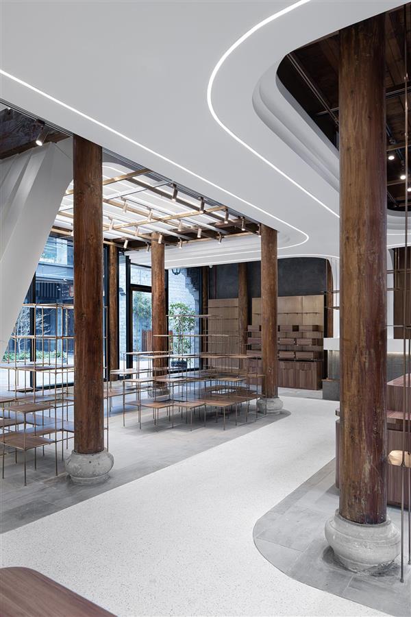 設(shè)計團隊拆除冗雜的墻體,將原有的木結(jié)構(gòu)和墻體等材料簡單的暴露出來,在梁柱間置入猶如躍動的浪頭翻涌的連續(xù)白色曲面,將設(shè)備管線、強弱電線路等隱藏其中,讓視線可及處變得更加純粹簡約。