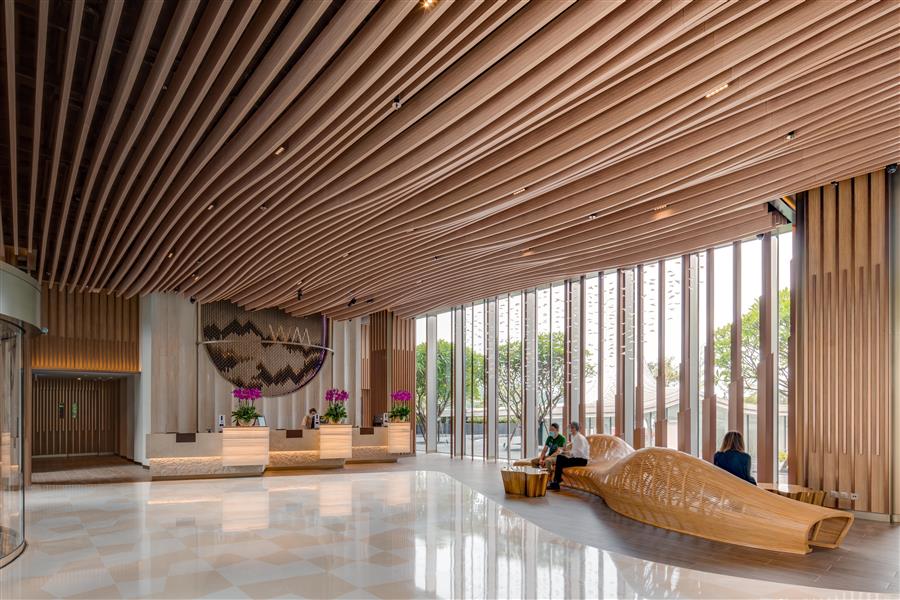 西貢WM酒店高三層,包含260間客房,并提供商業(yè)零售和婚慶服務(wù)。為實(shí)現(xiàn)最大限度利用海濱景觀提高海景房數(shù)量,設(shè)計(jì)采用“之”字形,布局三座獨(dú)立建筑。此外,設(shè)計(jì)充分考慮到周邊城市肌理,讓酒店外觀與西貢的低層建筑和諧相融。