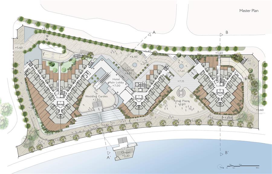 面向大海的一側(cè),設(shè)計(jì)通過 "之 "字形布局打造了兩個(gè)下沉式廣場。其中南側(cè)為婚禮花園,通過坡形臺(tái)階可以通向小教堂,最大限度減少了對海景的阻擋,同時(shí)也提供了拍照場地。北側(cè)為商業(yè)零售廣場,設(shè)計(jì)沿外圍打造了可供觀看活動(dòng)和表演所設(shè)的露天劇場;向里走訪客可在水景旁盡享美食。設(shè)計(jì)以海濱風(fēng)光下,將商業(yè)、娛樂和服務(wù)相結(jié)合,打造出充滿活力的休閑目的地。