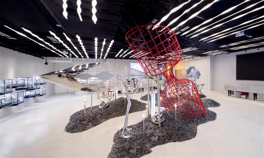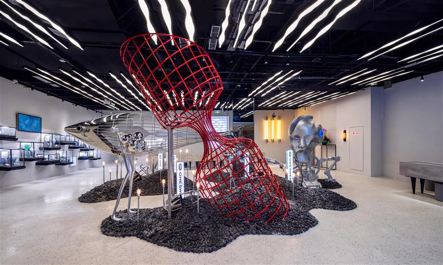 當(dāng)代室內(nèi)空間設(shè)計不僅局限于傳統(tǒng)家具、墻頂?shù)纳罨晟?。隨著工業(yè)的成熟進(jìn)步,與人們對商業(yè)空間體驗(yàn)的認(rèn)知升級,不銹鋼藝術(shù)裝置、3D打印技術(shù)被更為廣泛的應(yīng)用在室內(nèi)設(shè)計中,以打破傳統(tǒng)珠寶行業(yè)單一乏味的固有模式,呈現(xiàn)更具個性化空間。新技術(shù)和新業(yè)態(tài)融合,跨界裝置設(shè)計,探尋新時代下的創(chuàng)新美陳空間。