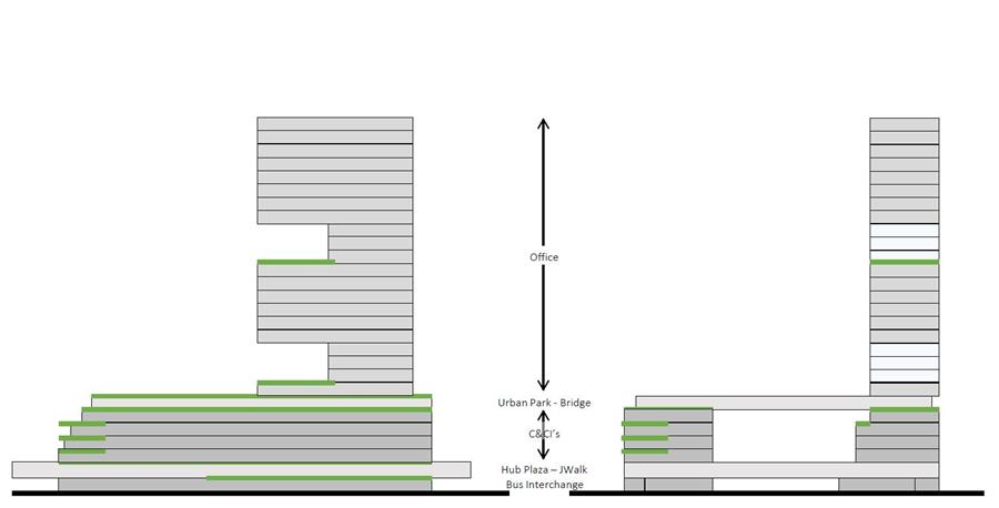 項目包含辦公、公共設施以及零售空間。地塊被軌道交通一分為二,27層的塔樓與8層的裙樓通過空中連廊彼此連接。設計采用水平分層的方式,簡化塔樓體量,加強了不同層級間的連續(xù)性;同時通過公共和休息空間的垂直堆疊,使土地利用最大化。