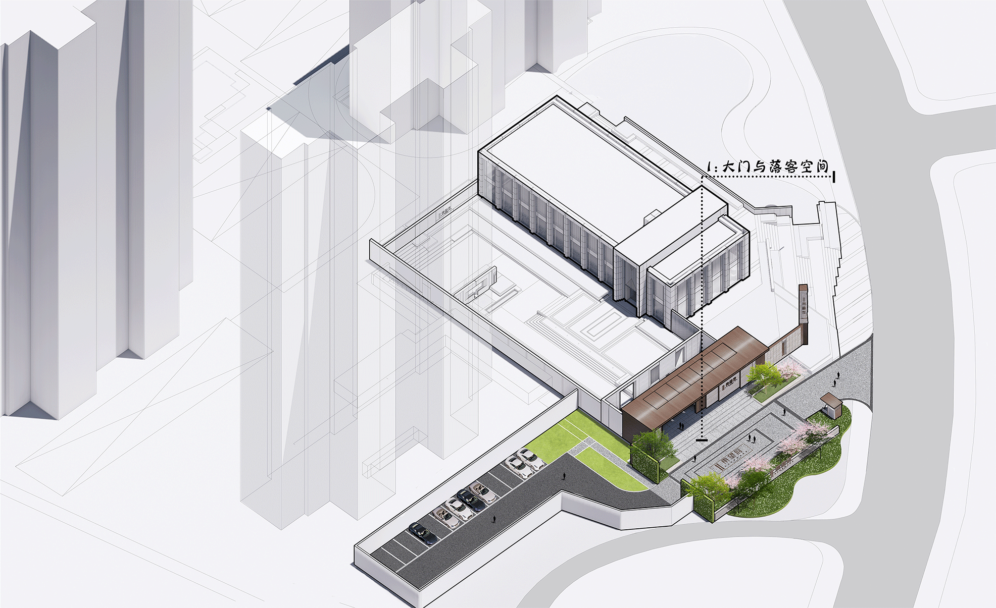 建筑通過大門——小徑——對(duì)景墻——進(jìn)入內(nèi)園——對(duì)景墻轉(zhuǎn)折——看到建筑——從而進(jìn)入建筑主體,幾經(jīng)轉(zhuǎn)折的排列方式,將多個(gè)空間層次進(jìn)行組合,通過不同尺度的場景切換,營造跌宕起伏的空間引人入勝,創(chuàng)造了豐富的觀感體驗(yàn)。