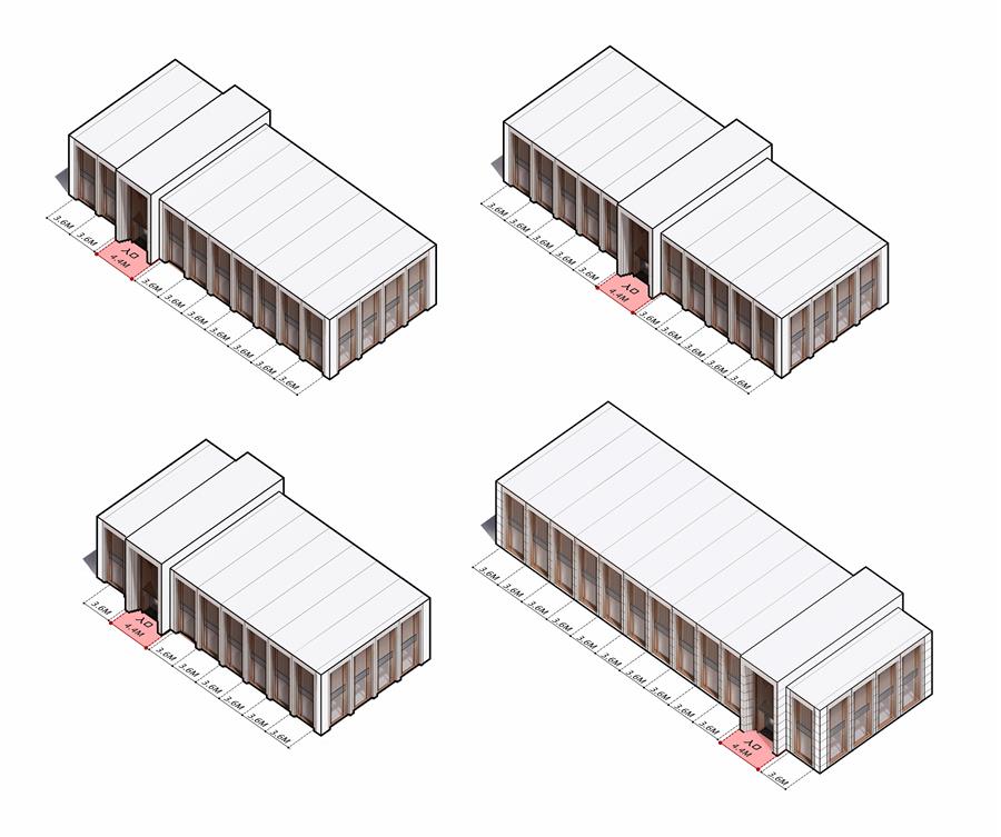 建筑由標(biāo)準(zhǔn)化的單元模塊組合,可以根據(jù)不同場地尺寸進(jìn)行跨數(shù)增減,根據(jù)環(huán)境自由組合生長。