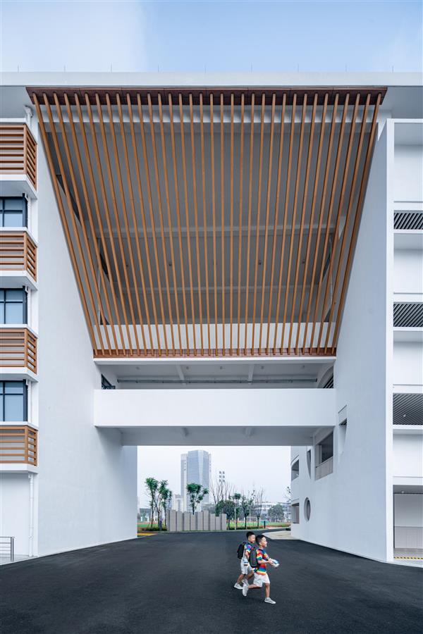 進(jìn)入校園的那一刻起,讓腳步跟隨建筑移動(dòng),也伴隨著時(shí)間緯度的變化,無論是相伴而行的綠化與樹木,還是密匝格柵透出的陽光,抑或是起伏變換的屋頂,形成壓縮和放大的理性空間,也將時(shí)間放到了行進(jìn)和停留間。連續(xù)的流線,在不同的轉(zhuǎn)折和節(jié)點(diǎn)上,融入了對(duì)于行進(jìn)速度的調(diào)節(jié),以起承轉(zhuǎn)合代替平鋪直敘。