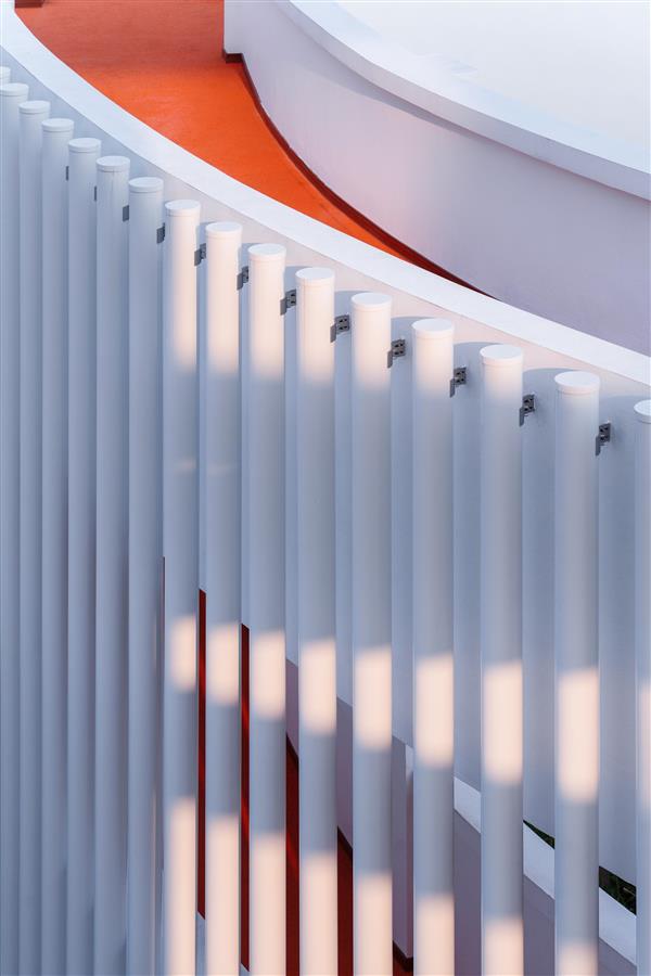 由連續(xù)的建筑體圍合出來的庭院間,一組環(huán)形廊道的置入,將原本集中于首層的公共活動(dòng)空間,在豎向上得以延伸,交疊的環(huán)形廊道讓建筑體和庭院產(chǎn)生了戲劇性的變化。原本的疏離和理性,由于廊道的運(yùn)動(dòng),形成了強(qiáng)烈的穿插與滲透,庭院一改原本的平鋪直敘,在收放之間,實(shí)現(xiàn)尺度和維度的更替,營(yíng)造出強(qiáng)烈的趣味性。