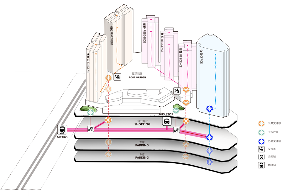 與此同時(shí),南北交通核及辦公核均向社會(huì)開(kāi)放,成為住宅和公寓的形象入口,通過(guò)平面網(wǎng)絡(luò)與豎向空間的整合,原本單純以移動(dòng)為目的的步行網(wǎng)絡(luò)也兼具了休憩、逗留和聚集的功能,而從地鐵方向來(lái)的辦公人流也可以進(jìn)一步帶動(dòng)商業(yè)活力。