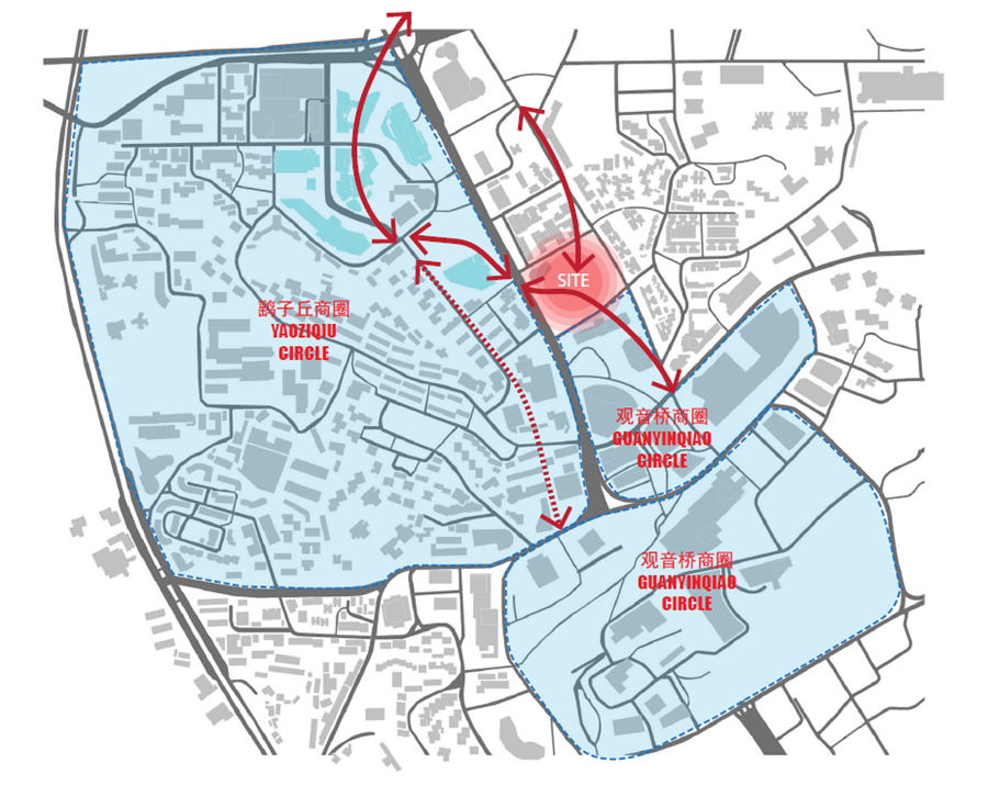 項目緊鄰城市主要干道,受重慶山地地形影響,南北兩側(cè)道路高差近16米,且地塊形狀不規(guī)則,周邊均為已建成建筑,其中東南側(cè)是協(xié)信星光68一期。如何在解決高差影響的前提下,讓建筑融入周邊復(fù)雜肌理,串聯(lián)起各大商業(yè),實現(xiàn)觀音橋商圈的升級,是設(shè)計首要解決的難點。