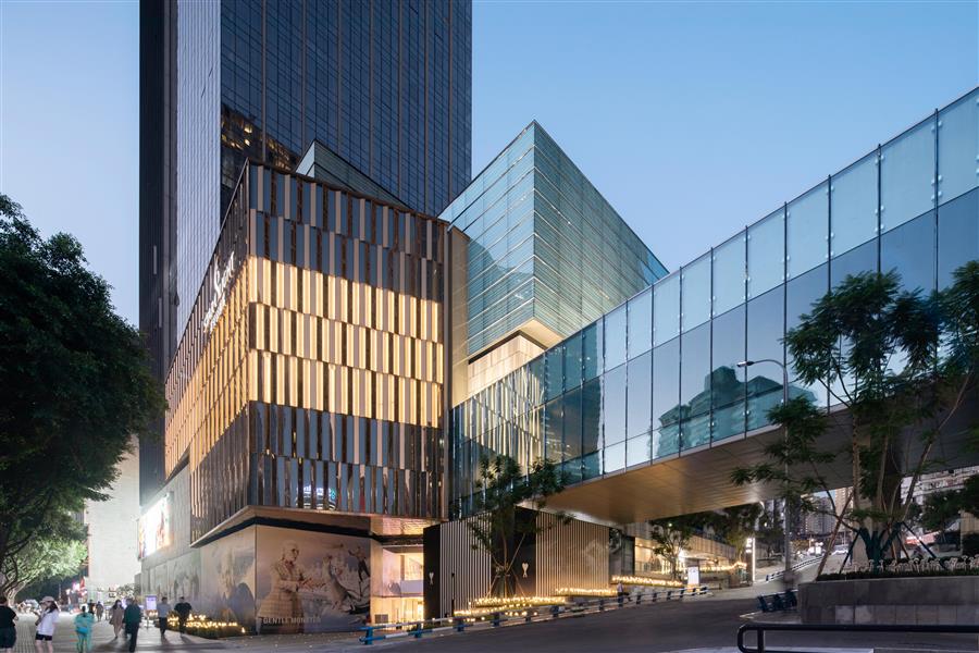 “我們希望充分利用場地極具重慶地形特點的大高差,構(gòu)建不同的城市界面,以不同的商業(yè)場景和多樣的氛圍體驗,將高差劣勢轉(zhuǎn)化為項目特色,打造重慶的商業(yè)新地標。” Aedas全球設(shè)計董事王燁冰如是說。設(shè)計將北側(cè)高點作為生活界面,通過公寓塔樓、電影院及商業(yè)購物中心主入口的形象打造,營造出充滿活力的地標場景;南側(cè)低點以典雅的辦公塔樓與周邊建筑一同營造出高端商務(wù)場景,以兩種情緒反差,為市民提供多樣的空間體驗。
