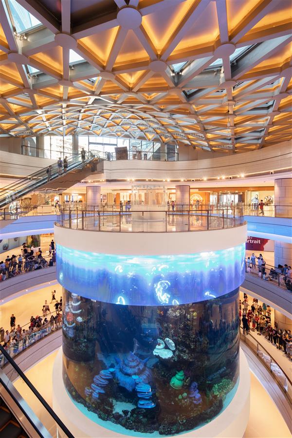 項目力圖打造西南高端商業(yè)航母,設(shè)計創(chuàng)造性提出以海洋作為商業(yè)設(shè)計主題,水平狀流線型立面元素寓意海水的流動,主要入口及臨街面通過折疊立面處理方式嵌入玻璃體,呼應(yīng)水晶概念。當夜幕降臨,猶如蔚藍海洋中嵌入了璀璨奪目的水晶,折射光芒,閃耀全城。并在中庭空間,以無縫的有機玻璃,打造出亞洲第一大室內(nèi)單體水族館,整個商業(yè)購物中心圍繞水族館以弧形退臺的形式構(gòu)建,360度全景式互動,提供獨一無二的購物體驗。