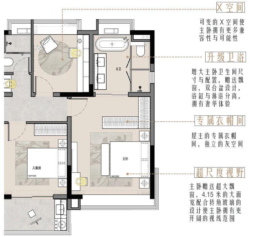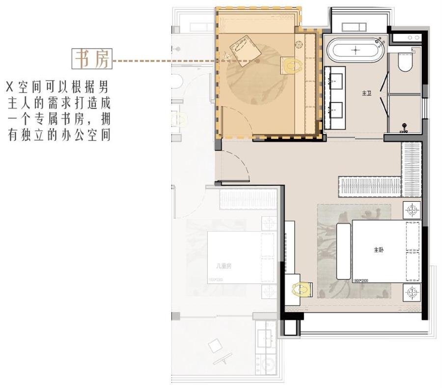 云萃府:增大主臥各個(gè)空間的尺度,贈送轉(zhuǎn)角飄窗,提高空間使用的幸福感與舒適度,同時(shí)設(shè)有X 空間,可根據(jù)戶主的不同需求進(jìn)行不同的功能轉(zhuǎn)換。