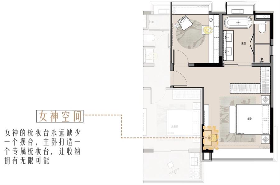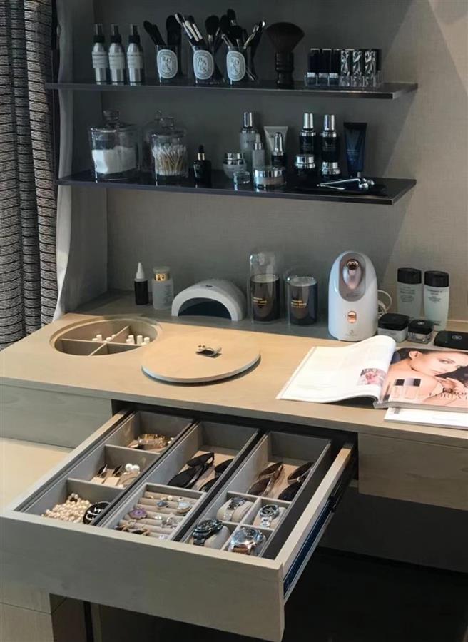在主臥臨窗處打造一個(gè)專屬的女神空間,配有專屬收納與化妝空間,女主人一邊化妝一邊欣賞窗外美景,很是愜意。
