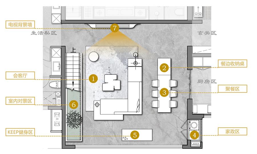 客群描述:這類的業(yè)主通常屬于外向型業(yè)主,生活工作之余喜歡約上三五好友在家中小聚,此時一個空間寬綽的社交方廳正可滿足業(yè)主所需。