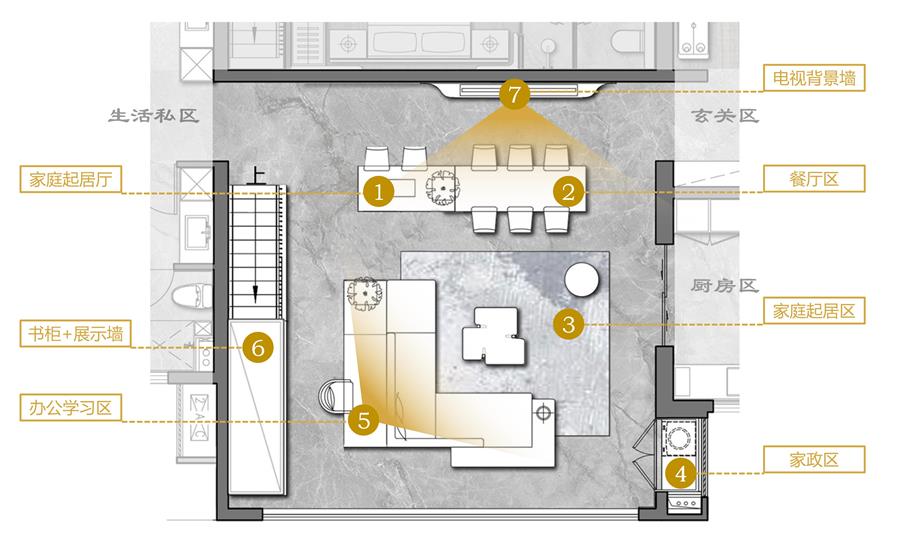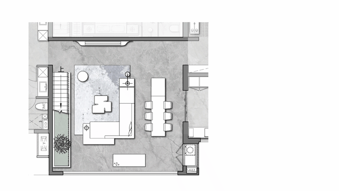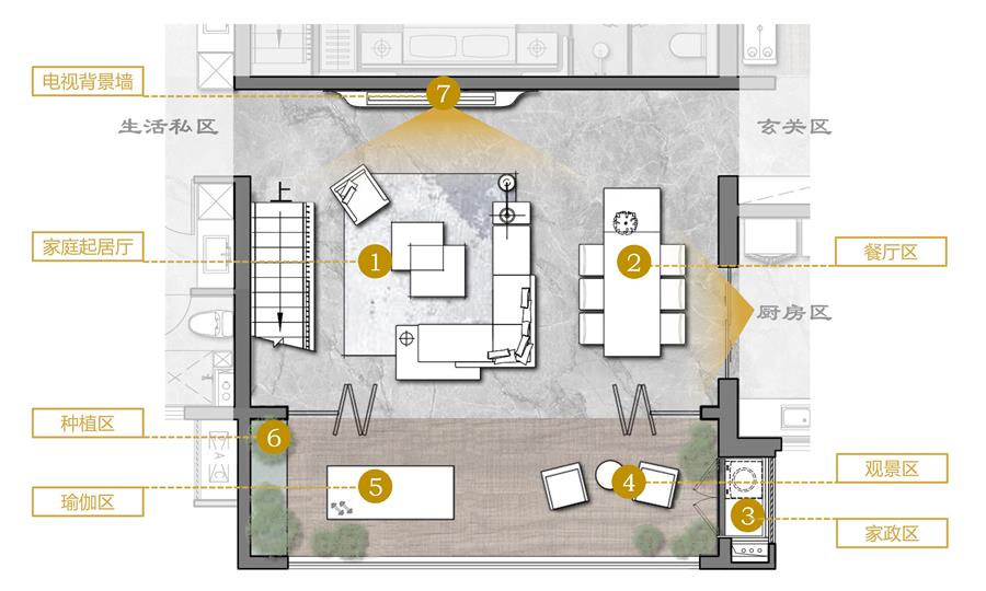 設(shè)計著重于提供一種可兼容多種生活方式的復(fù)合空間,滿足每個家庭對居住環(huán)境的不同構(gòu)想,這也是我們設(shè)計7.7*7.7m大尺度共享方廳的初衷,近60㎡的公區(qū)面積,可為多種生活模式提供場所。