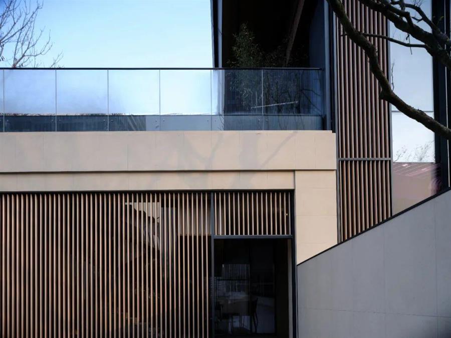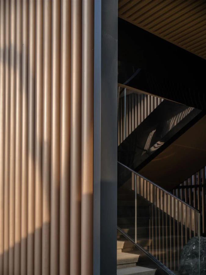 建筑立面材料選擇了方便拆裝的預(yù)制鋁方通,圓弧的處手法讓立面顯得更為精致,豎向線條簡約沉穩(wěn),現(xiàn)代的材料營造出古樸的質(zhì)感。