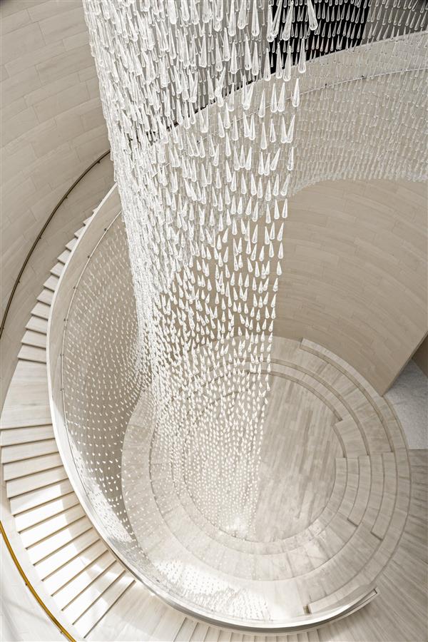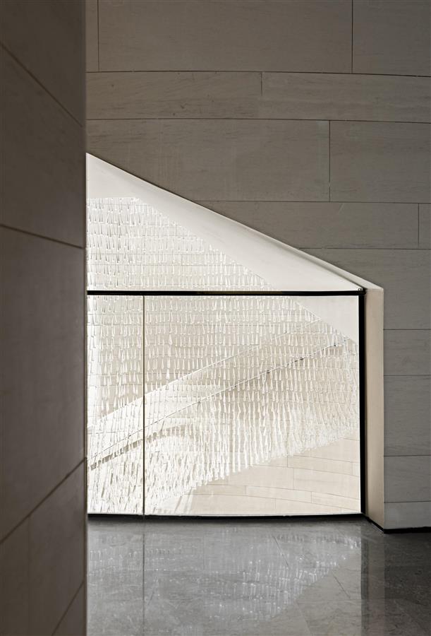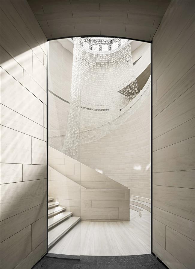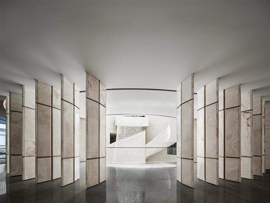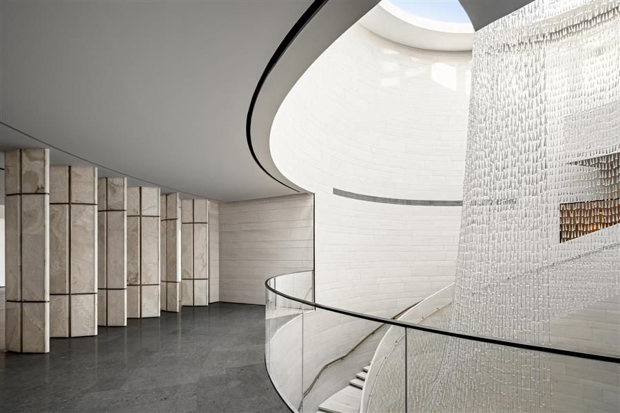 進(jìn)入這座海上“藝術(shù)方舟”,順著樓梯逆時(shí)針到達(dá)二層可俯瞰中庭自由的羅馬式廣場(chǎng),也可仰望四時(shí)晨昏的變化。再由二層順時(shí)針回到首層原點(diǎn)時(shí),不覺(jué)間已縱覽時(shí)間和空間兩種維度。