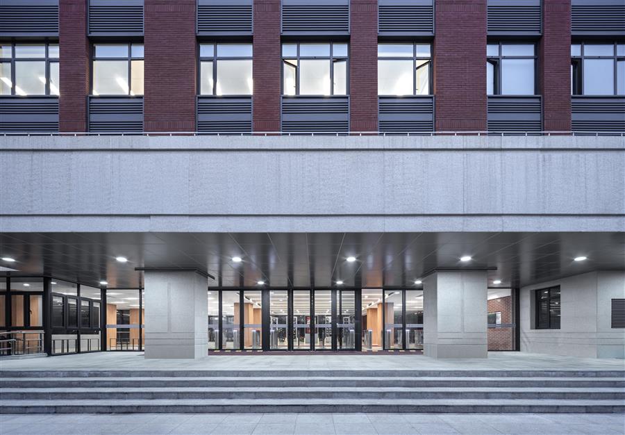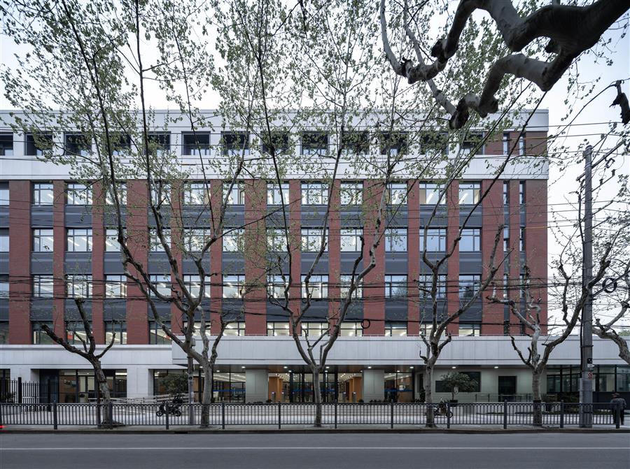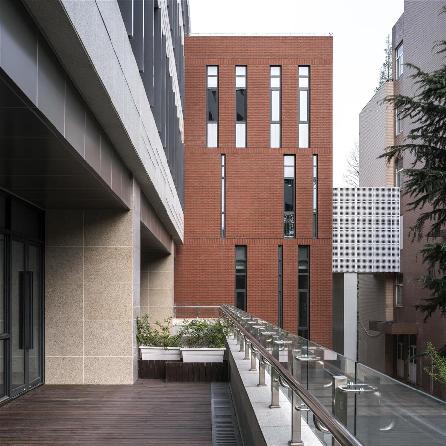 新建第二教學(xué)樓立面構(gòu)圖采用學(xué)院派建筑經(jīng)典三段式構(gòu)圖,選用紅色面磚呼應(yīng)復(fù)旦校園紅磚建筑傳統(tǒng),與校園主體色調(diào)相協(xié)調(diào)。同時(shí)設(shè)計(jì)融入現(xiàn)代建筑設(shè)計(jì)語言,運(yùn)用淺灰色金屬百葉創(chuàng)造富有韻律的立面效果。建筑整體形象端莊典雅而不失現(xiàn)代氣息。