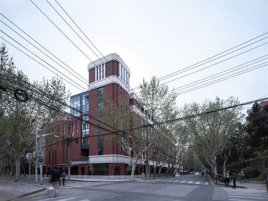 如何讓新建筑與校園原有建筑及周邊環(huán)境很好的對(duì)話和融合,成為設(shè)計(jì)師在前期規(guī)劃中需要解決的核心問題。因此,設(shè)計(jì)師主要從內(nèi)外兩個(gè)方面進(jìn)行綜合統(tǒng)籌。對(duì)內(nèi),充分尊重復(fù)旦附中校園整體規(guī)劃,強(qiáng)化校園入口空間主軸,將第二教學(xué)樓形成與問思樓對(duì)稱布置;對(duì)外,考慮基地基地北側(cè)國權(quán)路、東側(cè)政熙路沿街立面重要性,在街角設(shè)置塔樓,標(biāo)示學(xué)校城市形象。