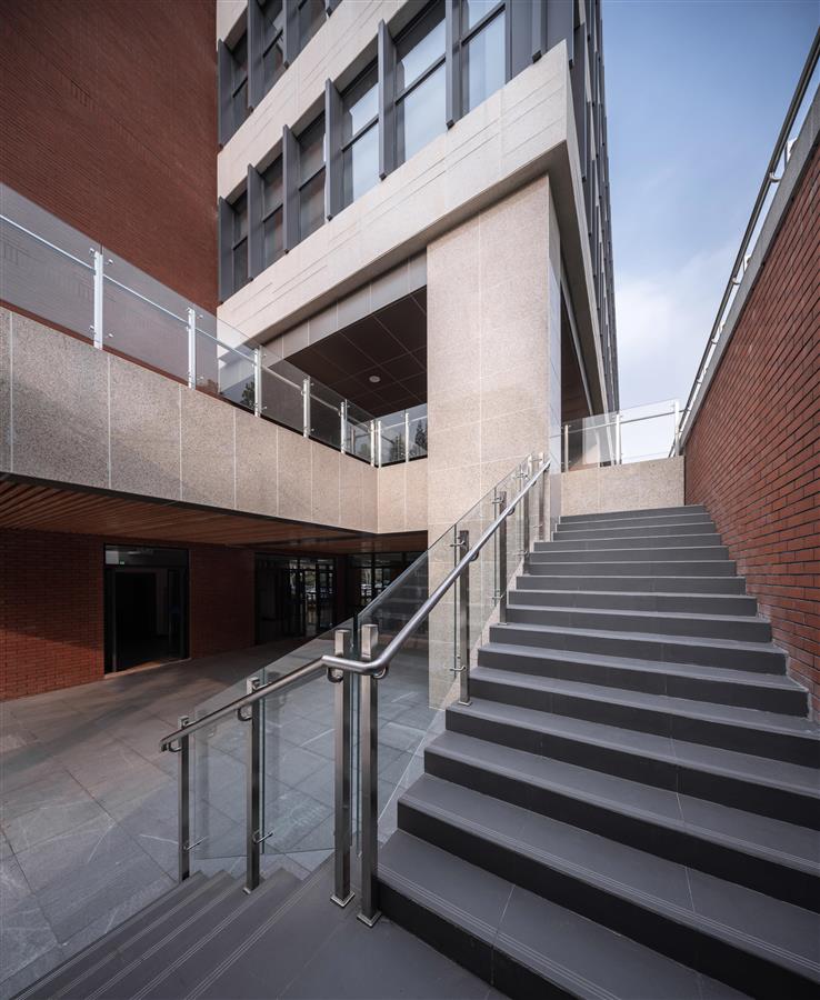 在建筑立面設(shè)計(jì)方面,尊重周邊建筑和環(huán)境空間,讓新建筑和周圍環(huán)境形成較好地對(duì)話和融合,同時(shí)考慮到建筑緊鄰城市道路,結(jié)合園區(qū)校門共同設(shè)計(jì),采用現(xiàn)代風(fēng)格,傳統(tǒng)三段式設(shè)計(jì)手法,運(yùn)用紅色面磚與校園主體色調(diào)相協(xié)調(diào)、輔以淺灰色面磚線腳分隔,形成了學(xué)校的獨(dú)特標(biāo)示。面向校園一側(cè)運(yùn)用淺灰色金屬百葉創(chuàng)造富有韻律的立面效果,使新建筑成為校園空間的積極元素。