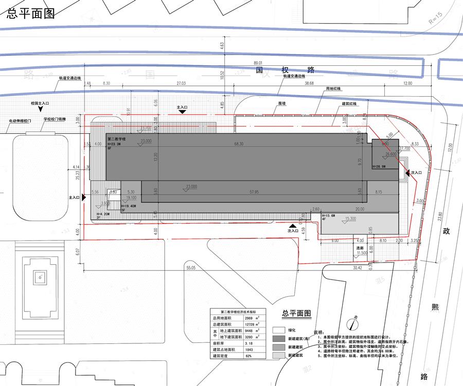 擁有近70年歷史的復(fù)旦大學(xué)附屬中學(xué),坐落于梧桐樹成蔭的國權(quán)路。本次工程拆除了校園內(nèi)5號(hào)樓(篤志樓)、階梯教室樓等危房,并整合周邊綠化場(chǎng)地進(jìn)行新建第二教學(xué)樓設(shè)計(jì)。新建第二教學(xué)樓建成后總建筑面積為12728㎡。其中地上建筑面積9326㎡,地下建筑面積3280㎡,建筑層數(shù)為地上6層、地下2層,建筑高度為24m。