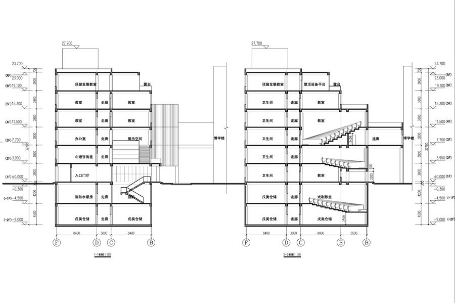新建第二教學(xué)樓在一層布置入口門廳、門衛(wèi)及消控室、校史展示區(qū)、前臺(tái)接待、休息區(qū)等展示接待功能空間。學(xué)生服務(wù)功能空間主要位于建筑的二層和三層,其中二層主要為心里咨詢和衛(wèi)生保健服務(wù)功能,三層主要為學(xué)生社團(tuán)服務(wù)功能,二層、三層同時(shí)均布置有滿足不同教學(xué)需求的標(biāo)準(zhǔn)教室和階梯教室。此外,二層到三層通高的地方還設(shè)有階梯狀展示平臺(tái),從而為學(xué)生和老師的教育研討、交流展示提供場(chǎng)所,也增強(qiáng)了空間的多樣性和趣味性。四層至六層以教室類功能空間為主,有效確保了教學(xué)環(huán)境的安靜,為學(xué)生提供免受干擾的高效教學(xué)空間。地下一層及地下二層創(chuàng)建了大量倉儲(chǔ)間,滿足教學(xué)用品的存儲(chǔ)需求。第二教學(xué)樓的建設(shè)更好地滿足學(xué)校新課改的教育教學(xué)需要,為師生提供了功能豐富,配套齊全的教學(xué)空間。