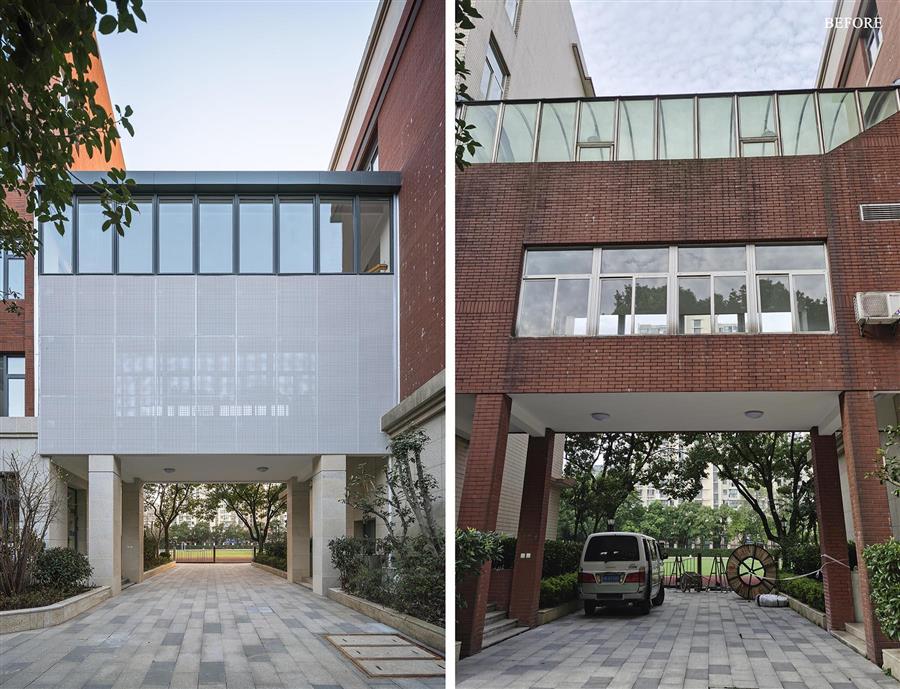 博學樓因其造型方正,視覺感受上高于邊上的旦華樓,所以在四層位置增加白色鋁板和白色方孔穿孔鋁板作為線條將旦華樓白色線條延續(xù),使得南立面整體形象得到了統(tǒng)一和提升;此外,三層、四層突出一個體量增加立面變化同時,將原本分布在各層的48臺空調(diào)外機統(tǒng)一放置在穿孔鋁板后,使立面更加整潔。