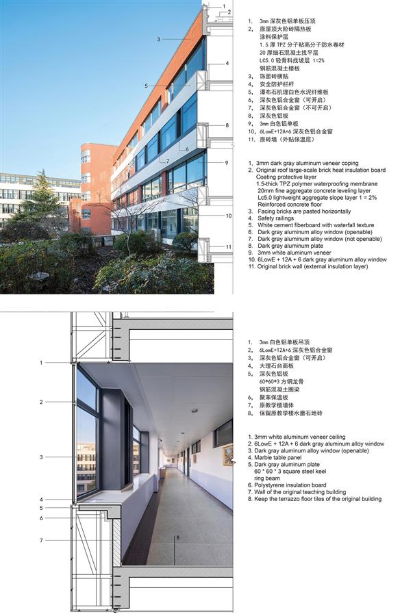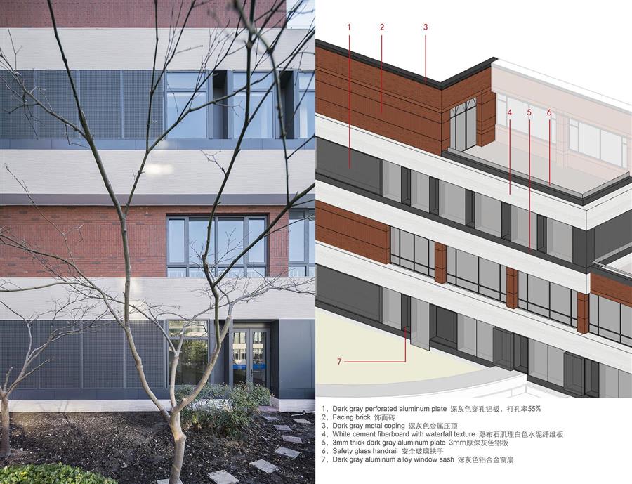 博學外立面在設計伊始便將可實現(xiàn)性考慮在內(nèi),為了不給教學樓增加額外的荷載,我們拆除部分厚重的窗間墻和挑板以減輕自重,再使用重量相對較輕的水泥纖維板和穿孔鋁板作為外立面的裝飾材料,在紅磚帶來的厚重感和歷史氣息之余,為建筑增加一抹靈動和現(xiàn)代氣息。