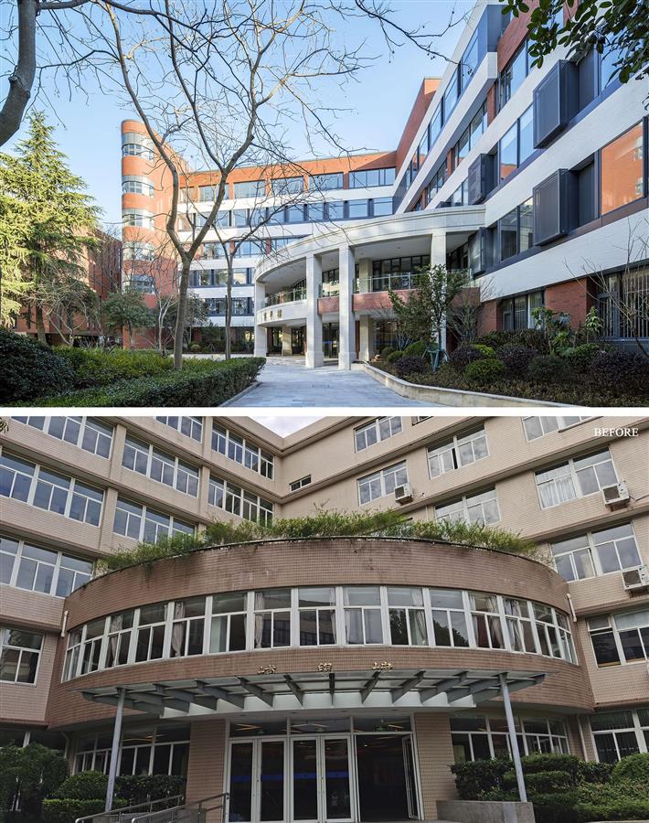 △學樓入口處新舊對比,柱廊的加入讓入口空間更加多樣
