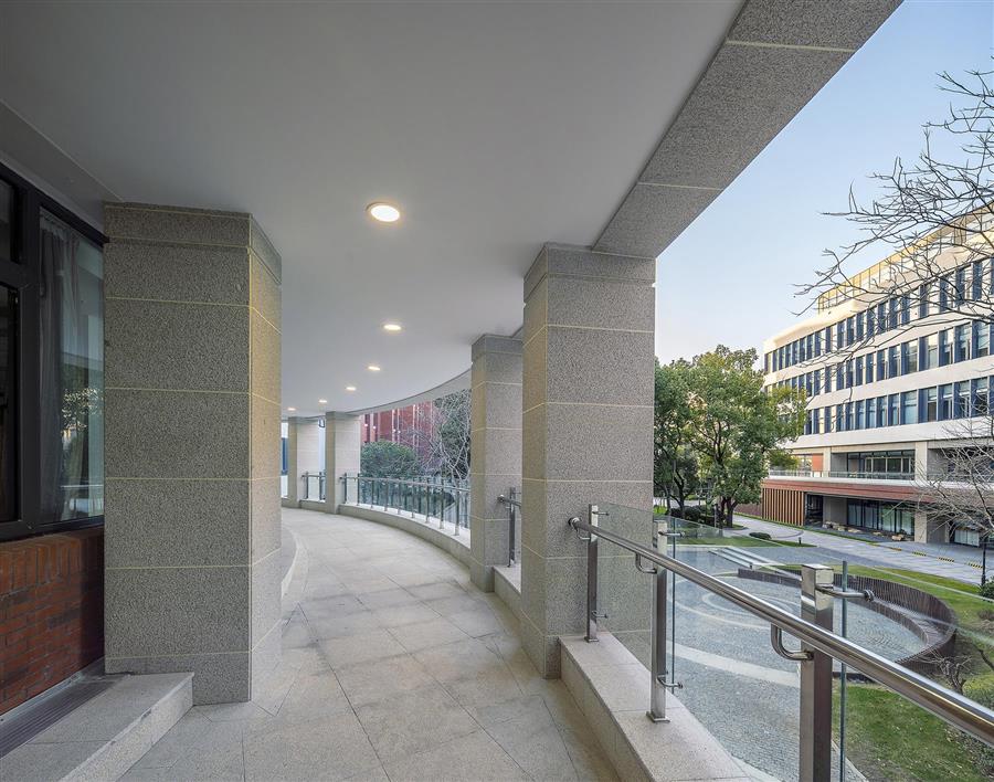 △柱廊二層活動平臺,與篤志樓二層平臺,中心下沉花園視線相通,空間延續(xù)