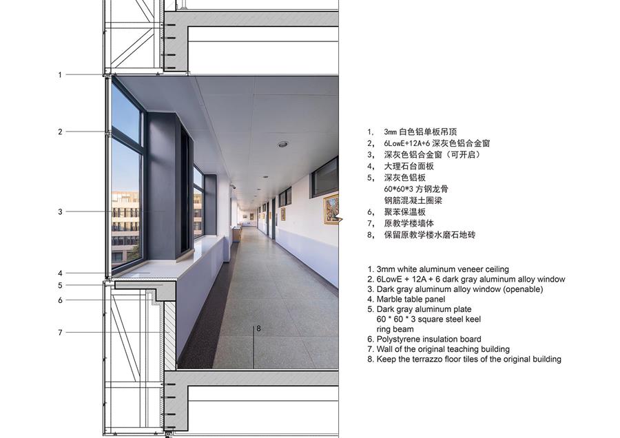 在設計的過程中,我們保留了原教學樓的結構體系的同時,增設飄窗,改善了原走廊單調(diào)的線性空間,增大了學生與教職人員駐足交流的可能;鋁合金開啟扇加大取景窗的組合,讓更多校園美景伴隨陽光映入教學樓之中。而歷史悠久的水磨石地磚也在施工過程中也得以最大程度地保留和保護,以訴說屬于博學樓的歷史和輝煌。