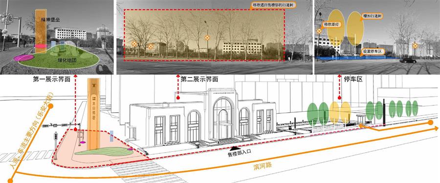 考慮完善城市空間界面,場地布置沿濱河路橫向展開,利用空間維度依次布局:第一界面——精神堡壘,第二界面——沿街封面,第三界面——場地停車區(qū)。