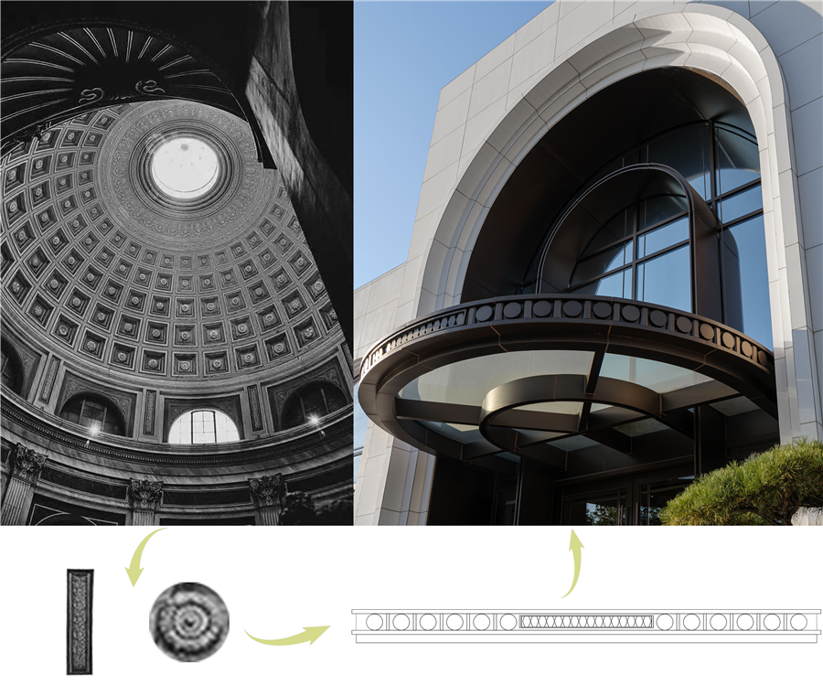 設(shè)計(jì)語言引入經(jīng)典的圓拱形態(tài),柔性的圓弧搭配簡潔有力的直向線條,厚重中帶著輕靈,低調(diào)中彰顯優(yōu)雅。