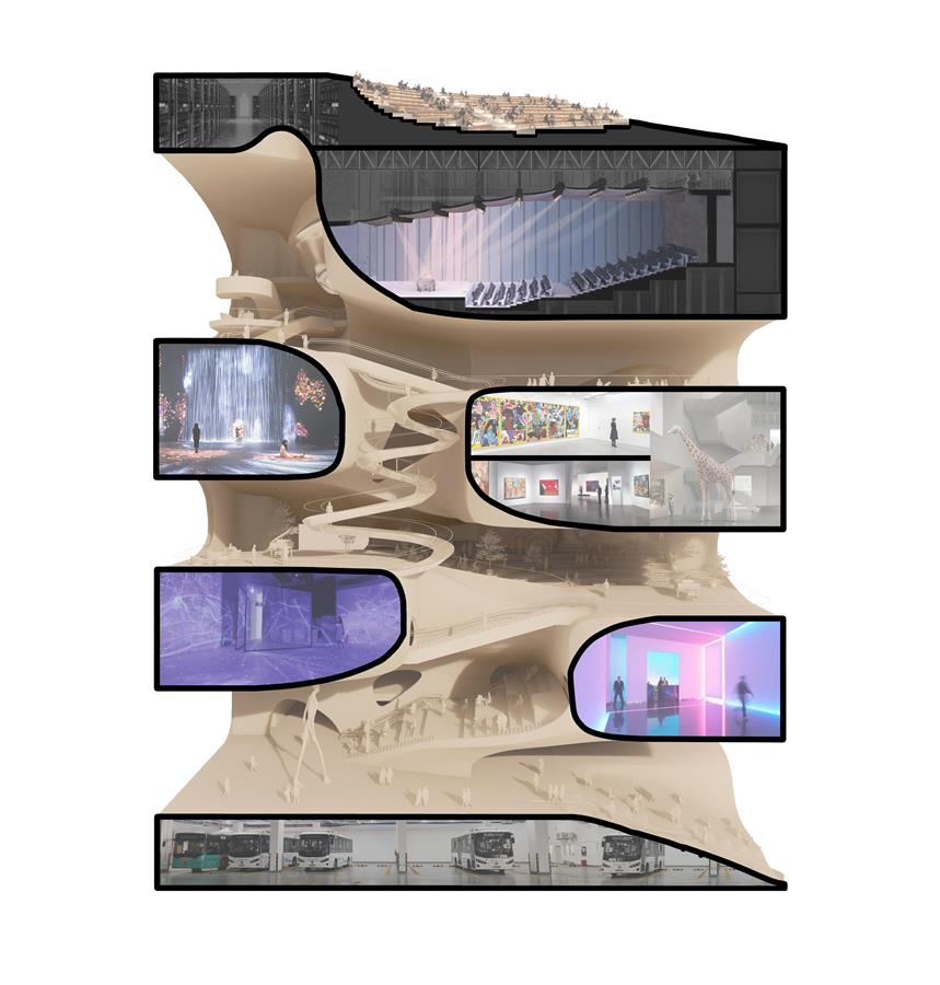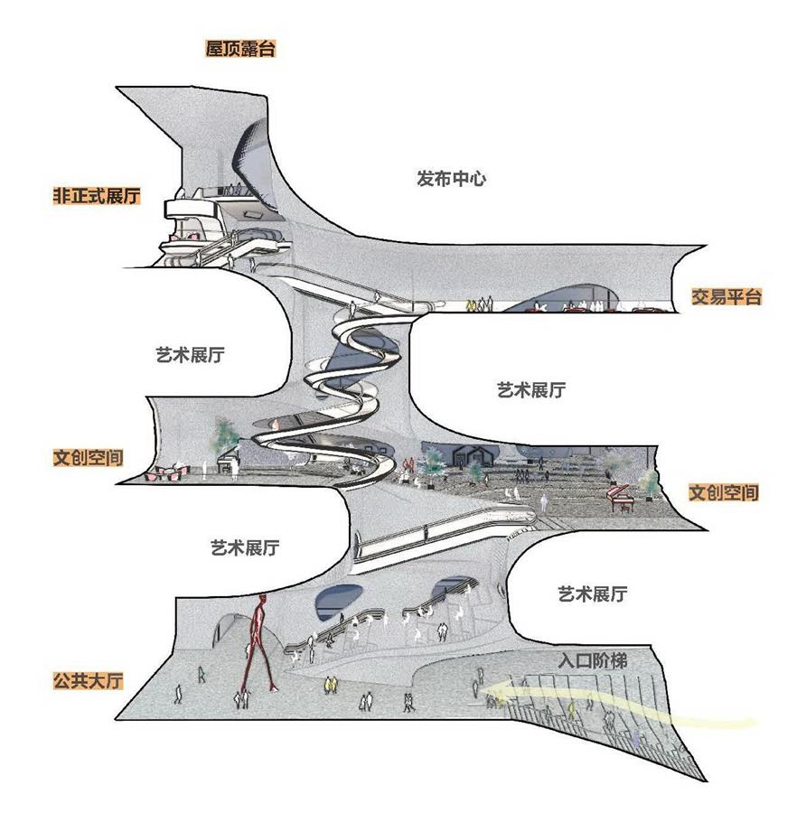 建筑內(nèi)部以一個(gè)垂直向上的流動(dòng)藝?yán)?,串?lián)起入口階梯、公共大廳、藝術(shù)展廳、文創(chuàng)空間、藝術(shù)工坊、教育空間、發(fā)布中心、屋頂露臺。