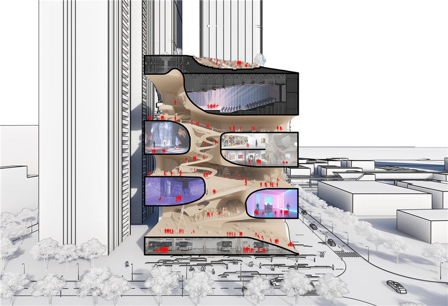 同時(shí)為了更積極地回應(yīng)城市的訴求,設(shè)計(jì)團(tuán)隊(duì)提出“公共空間返還率”的概念,將文化中心定義為一個(gè)新型的全時(shí)段公共空間,白天所有的空間對外開放,閉館后的流動(dòng)藝?yán)纫廊幌蚴忻耖_放,使其因時(shí)間和空間上的多種利用而衍生出更多的價(jià)值。
