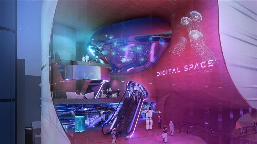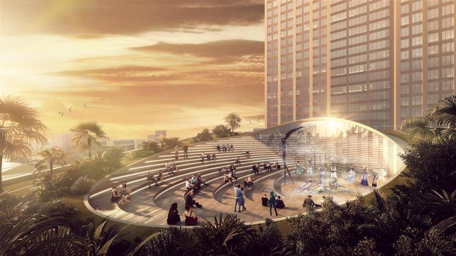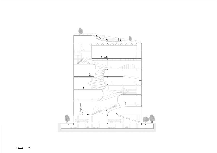 通過空間的抬升和視野的延展,鼓勵(lì)人們探尋不同空間與維度上的視覺觀感,流動(dòng)藝?yán)纫员P旋的姿態(tài)不斷上升,最終在頂部為人們呈現(xiàn)一片壯闊的城市視野。