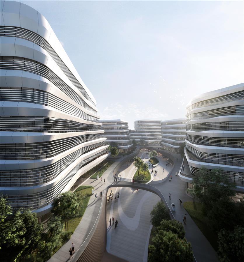 西地塊以“山水”為設(shè)計(jì)概念,結(jié)合院落圍合的空間形態(tài),建筑組團(tuán)整體側(cè)重宏大的山勢(shì)水態(tài),三棟主體建筑塔樓如同山體,空中廊橋、花園和流水般的人行坡道穿插其間,“山石”錯(cuò)落有致形成了層層疊疊的陽臺(tái)。這里未來將作為獨(dú)角獸企業(yè)的總部辦公大樓;環(huán)繞連接三棟塔樓的白色裙房體量,將作為相對(duì)自由靈活的共享辦公空間功能,如同一片祥云縈繞在山間。