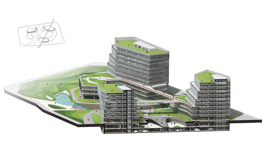 本項(xiàng)目標(biāo)準(zhǔn)綠地率高達(dá)30%,通過引入自然景觀,創(chuàng)造出更加綠色低碳的環(huán)境,實(shí)現(xiàn)可持續(xù)發(fā)展;同時(shí)由“山水之環(huán)”構(gòu)筑一條貫穿整個(gè)園區(qū)的城市慢行環(huán)廊,將各地塊的綠色景觀互聯(lián)互通,延伸形成一個(gè)更大的綠色健康網(wǎng)絡(luò);再通過采用高性能玻璃幕墻,外掛遮陽百葉幕墻構(gòu)件等等多種技術(shù)手段共同實(shí)現(xiàn)中國綠色建筑最高等級(jí)的三星標(biāo)準(zhǔn)。