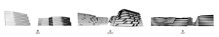 CAA將建筑幕墻的設(shè)計(jì)以中國人文山水畫《富春山居圖》為靈感,給予西、北、東三個(gè)地塊在外立面細(xì)部上不同的設(shè)計(jì)表達(dá)。通過數(shù)字化與綠色節(jié)能技術(shù)的運(yùn)用,比擬山水畫中不同的寫意皴法,構(gòu)成山、水、云相融合的自然意象,所謂“水云間”。