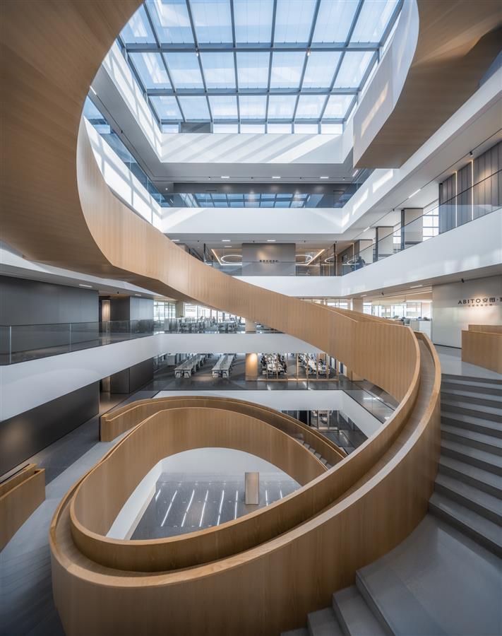 回望中庭,樓梯宛若一座沐浴在陽光下的“游廊”,可開啟天窗為所有樓層的員工提供充足的陽光和新鮮空氣,在工作間隙讓頭腦徹底放松,中庭也成為企業(yè)獨一無二的標志性的身份特征。