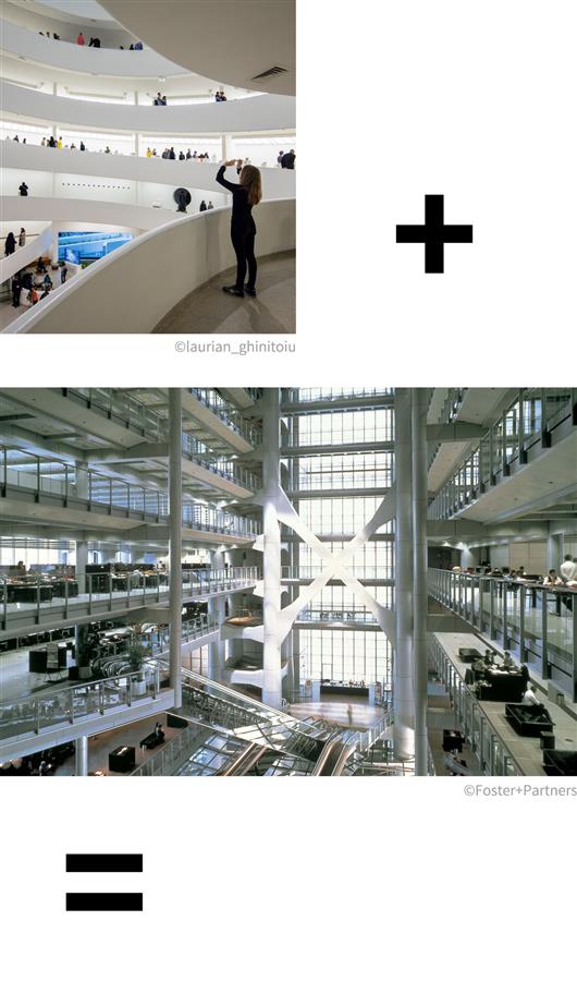 我們說,零壹城市設(shè)計的不是房子,而是有趣的生活方式。對使用者真實需求的研究是我們設(shè)計的出發(fā)點,游覽與辦公是兩種我們提取的核心需求。于是,設(shè)計團隊提出的策略是“Promenade Workplace 游覽式辦公” 。將紐約古根海姆博物館的環(huán)形動線與香港匯豐銀行大廈陽光充裕的中庭結(jié)合起來會發(fā)生什么?