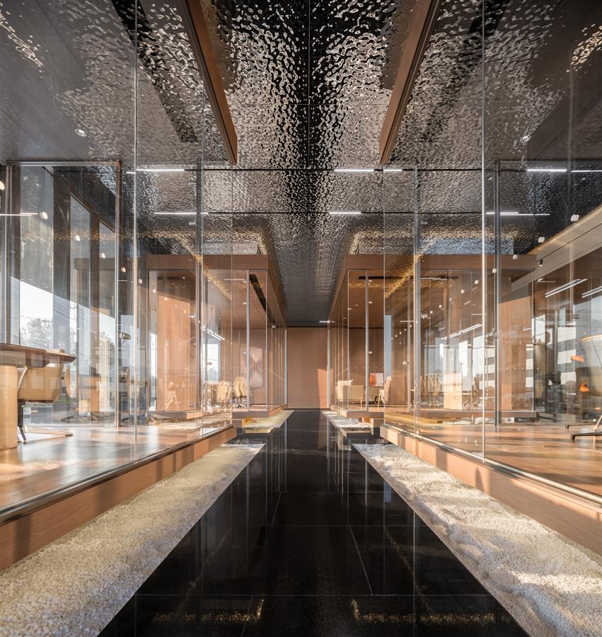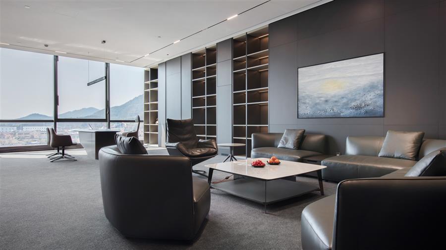 行至六樓行政層,整體風格變得商務(wù)穩(wěn)重,彰顯現(xiàn)代商務(wù)總裁氣息,展現(xiàn)了多種不同性格的總裁辦公空間。