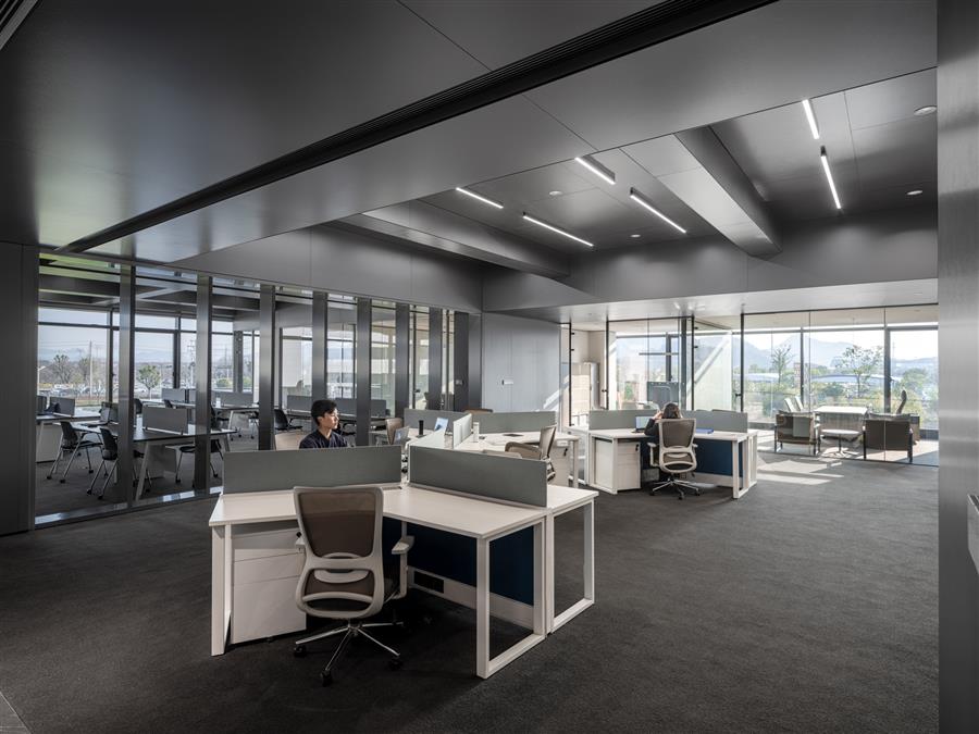 以高效私密和開放交流為光譜的兩軸,設(shè)計團隊設(shè)計了完全私密的電話亭,部分私密的玻璃盒子辦公區(qū),半開放的格柵盒子辦公區(qū),以及完全打開鼓勵交流的開放式辦公區(qū)。不同尺度,不同開放度的辦公區(qū),為所有員工提供了包容、公平、有彈性、可持續(xù)和健康的工作空間,社恐與社牛,各得其所。