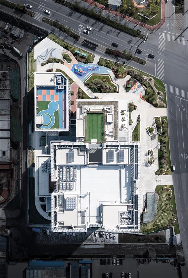 在建筑語(yǔ)言上,設(shè)計(jì)團(tuán)隊(duì)也通過一個(gè)個(gè)的“盒子“回應(yīng)其功能,形成“托育”盒子,“劇場(chǎng)”盒子,“書店”盒子,“培訓(xùn)與傳承”盒子……不同盒子互相交錯(cuò),形成豐富有趣,可停留可游走的灰空間。